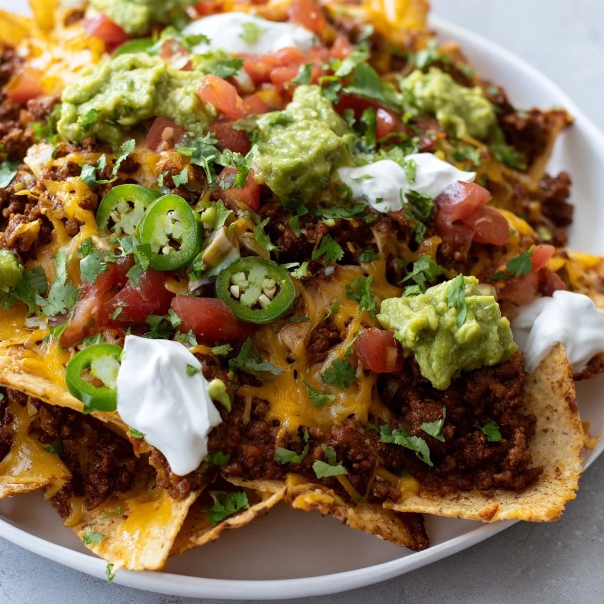Diese knusprigen Nachos vereinen saftiges, gewürztes Rindfleisch mit geschmolzenem Cheddar- und Monterey Jack-Käse. Frische Jalapenos sorgen für angenehme Schärfe, während Tomaten, schwarze Oliven und Koriander zusätzliche Frische und Aroma bringen. Schnell zubereitet lässt sich der Snack im Ofen überbacken, wodurch der Käse herrlich zart und goldbraun wird. Serviere dazu saure Sahne und Guacamole für eine perfekte Geschmackskombination.