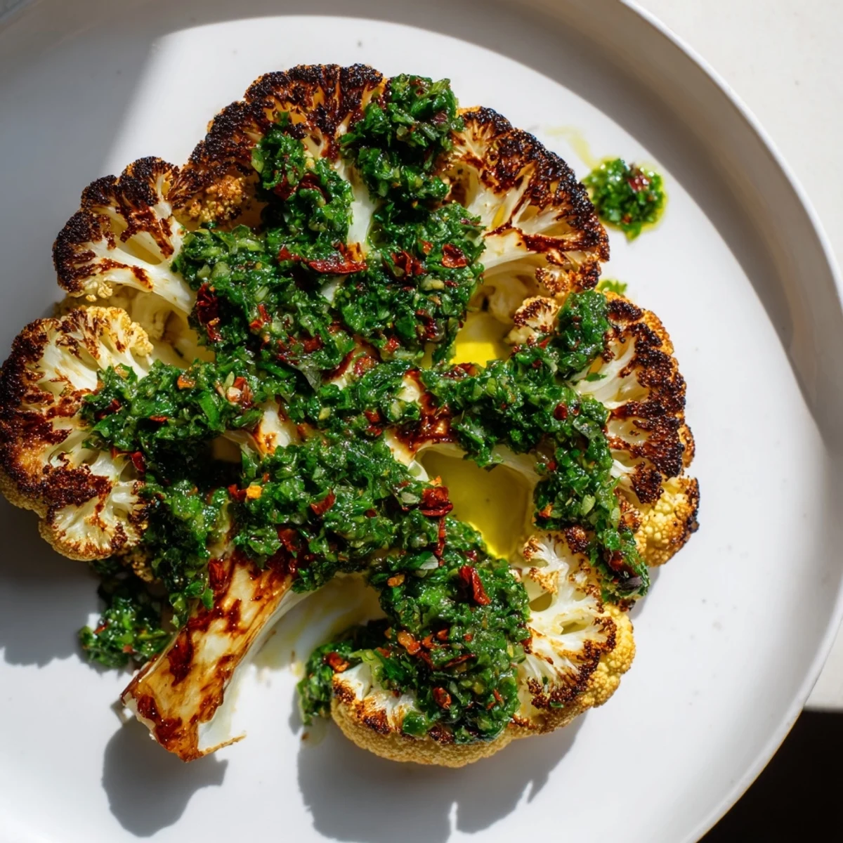 Chimichurri ist argentinisch, aber in diesem Rezept ist es der Kleber, der alles zusammenhält. Es ist herb, säuerlich und würzig – der absolute Gegenpol zur milden Süße des gerösteten Blumenkohls. Jeder Bissen ist interessant, überraschend, bereit für das nächste. Wenn Sie denken, dass Sie Chimichurri nicht mögen, weil Sie es aus einer Flasche probiert haben, geben Sie dieser Version eine Chance; frisch gemachte Chimichurri ist ein anderes Tier völlig.